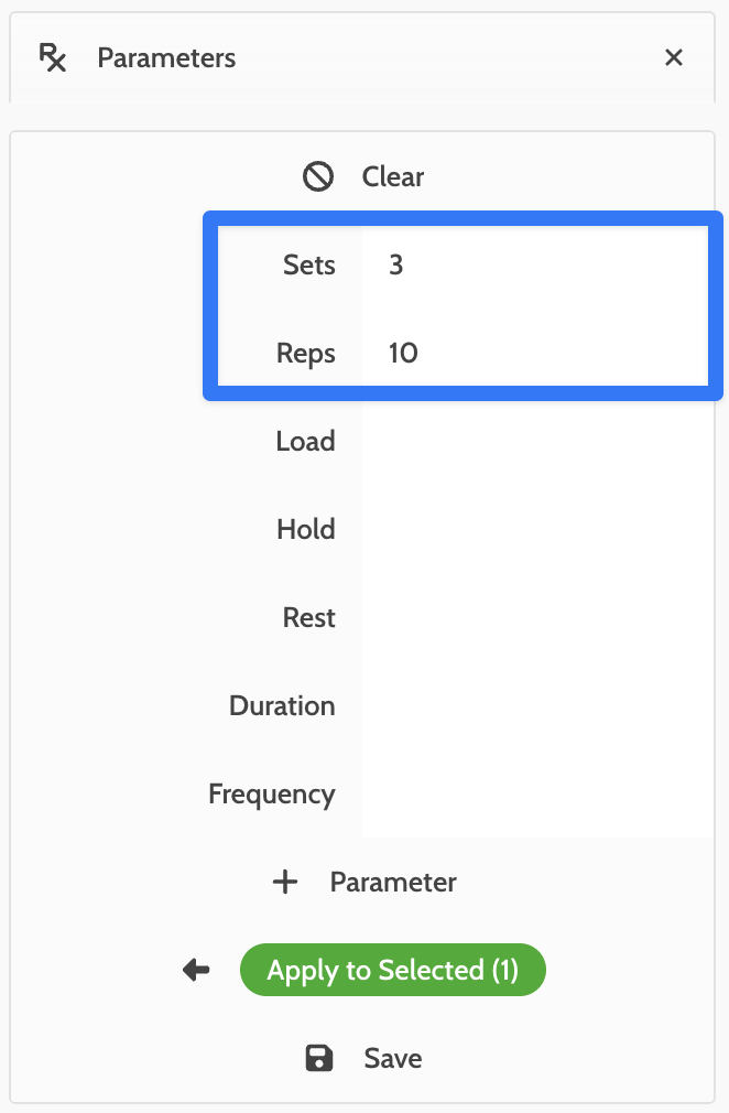 5. To add this Parameter to your exercise(s), select the exercise(s) you want by clicking on the Circle icon on the left of the exercise.