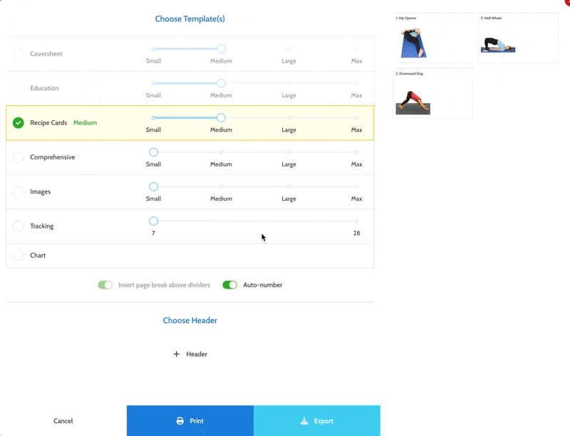2. You will then be prompted to customize the view of your printout. Chose the template format that works best for your client and adjust the size.