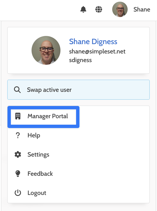 - Access your Manager Portal by clicking your profile in the top right corner and choosing Manager Portal