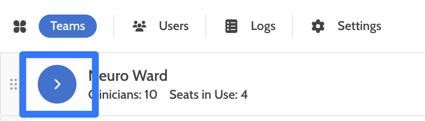 - Under the Teams area, select the Team that you wish to add Branding to by clicking the blue circle with the arrow beside the Team name