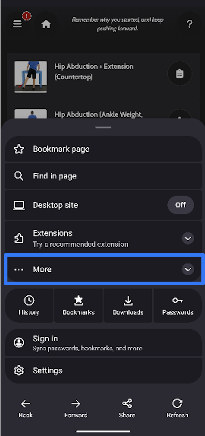 - Once you are logged in, click on the browser menu icon, it may be a three dot icon or could be something else depending on your browser. This will bring up your options. Click "More". Pro Tip: If you are using the Chrome browser on your Android device, you will not need to click "More".