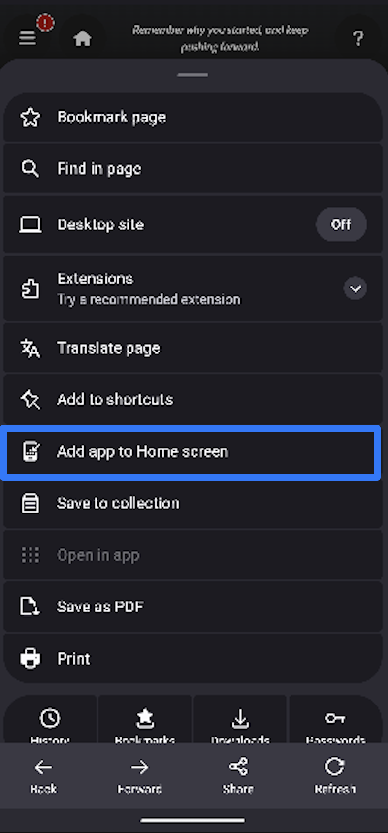 - Expand your options so that you can see all available options and choose the option "Add app to Home screen". Pro Tip: If you are using the Chrome browser on your Android device, the option you want is "Add to Home Screen"