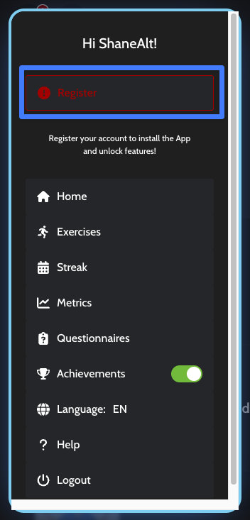 - You have the ability to Register your Client Account under the hamburger menu in the top left corner once you have logged in with the password your Provider sent you