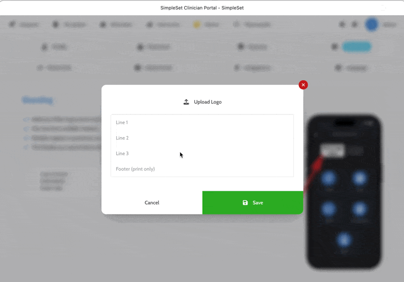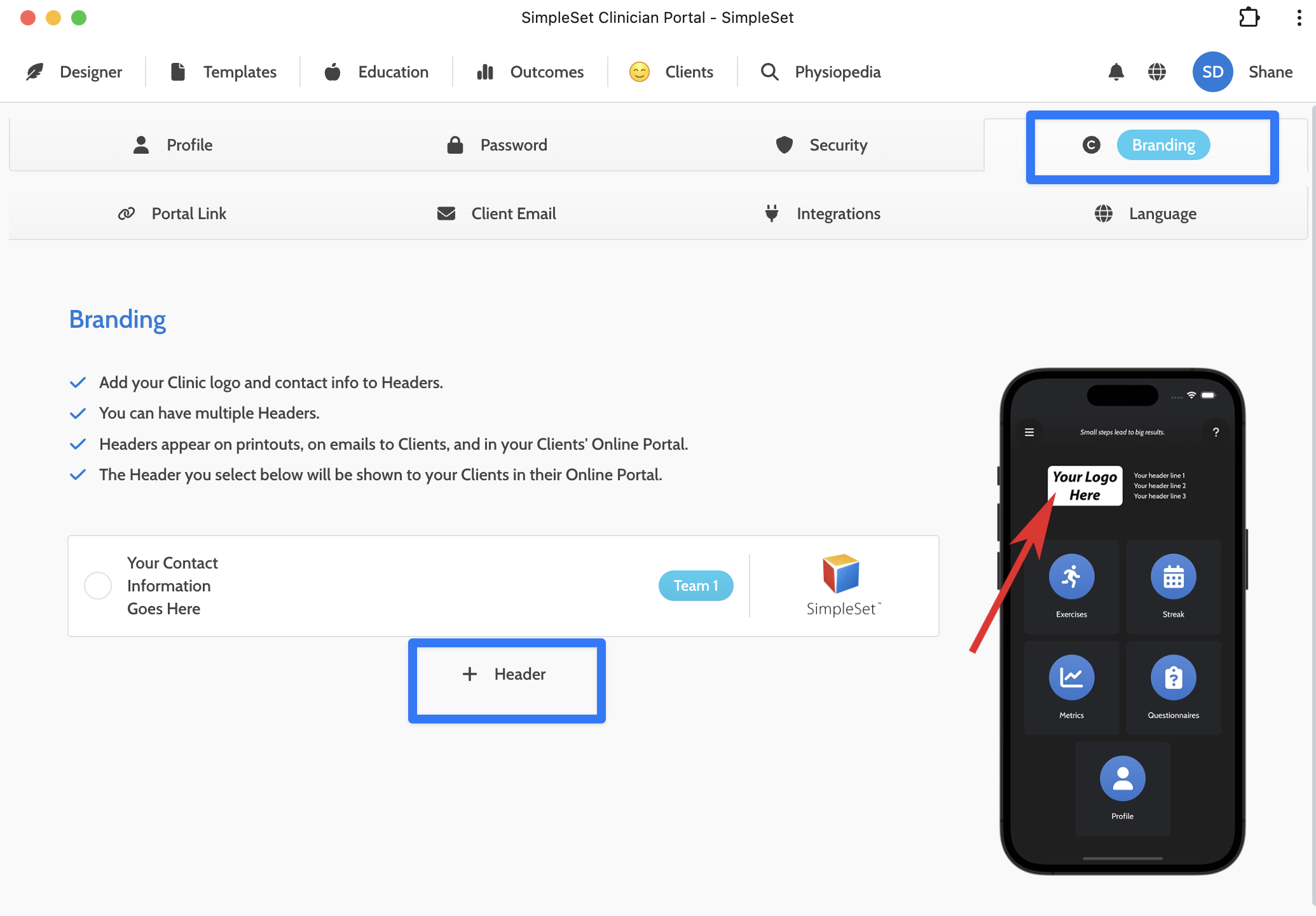 Your Logo and Contact Information will appear in every email sent from SimpleSet, at the top left corner of your printouts, as well as inside the Client Portal. To enter this information: