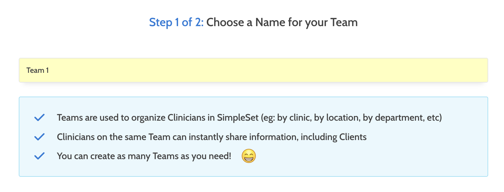 Think of Teams as a way of controlling who has access to shared information in SimpleSet. Staff on the same Team can easily share clients, custom exercise programs, custom outcome measures and custom educational content.