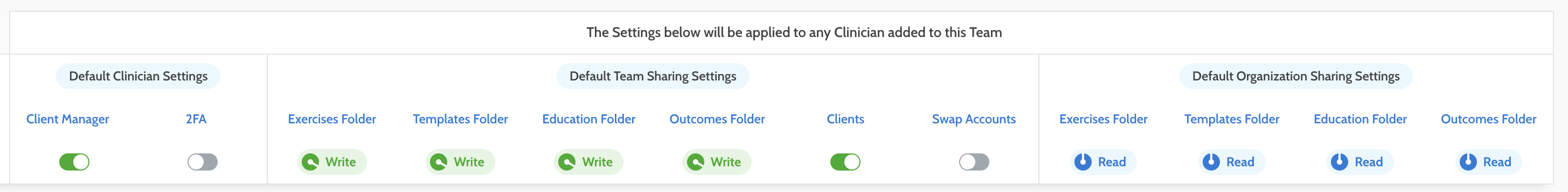 Team Sharing permissions control the type of information Staff on the same Team can share with each other - Exercises, Templates, Education, Outcomes and Clients. The default settings allow Staff to share everything. To provide "View Only" permission or to disable a permission altogether, click "Edit".