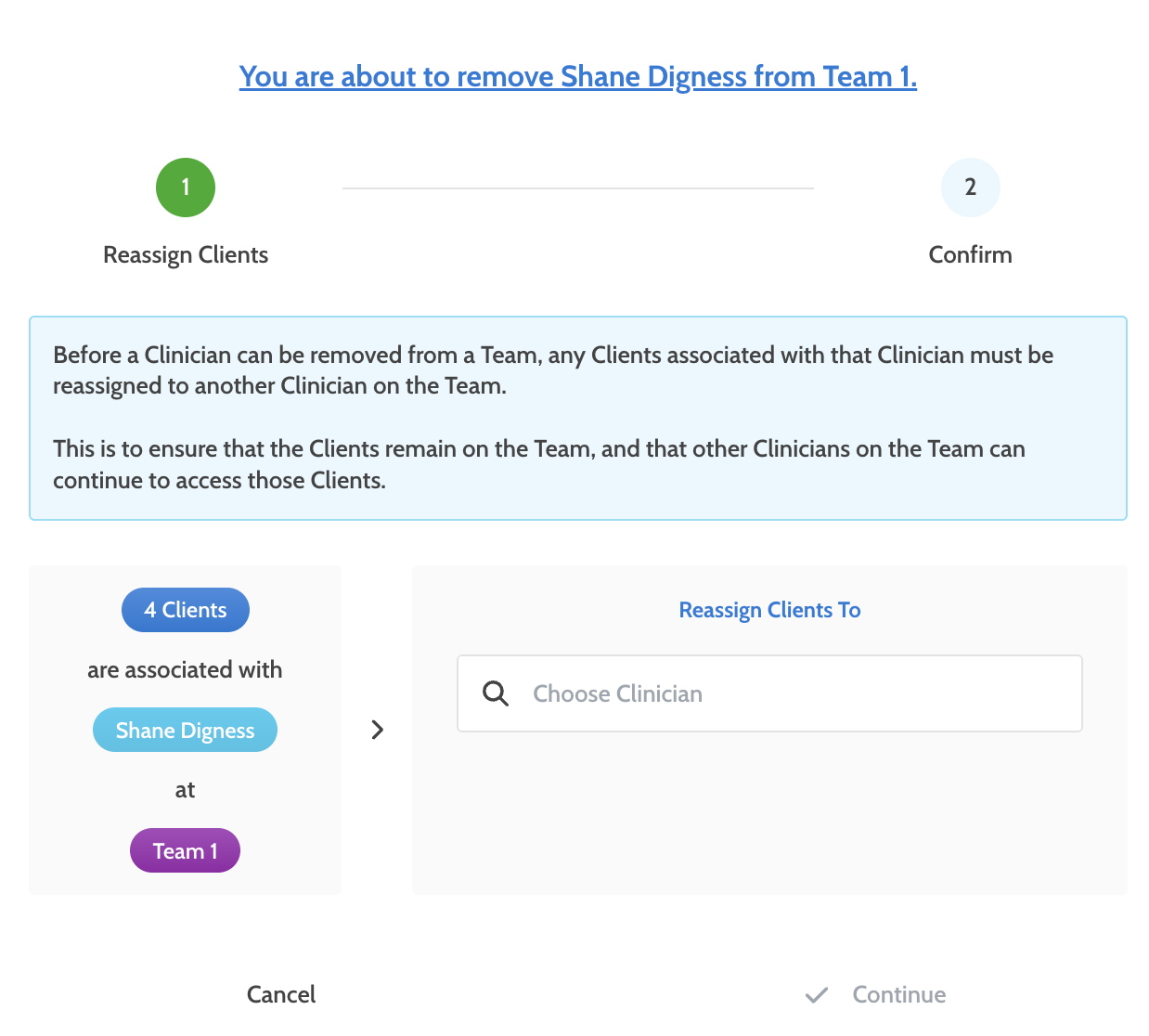 - If you are removing a Staff Member from a Team and they have Clients associated with them, you will be asked which other Staff member you want to transfer the associated Clients to.
