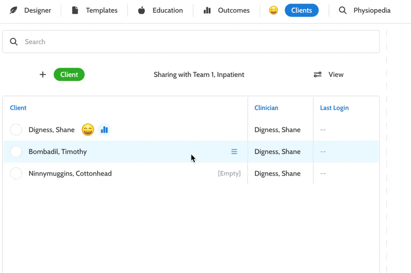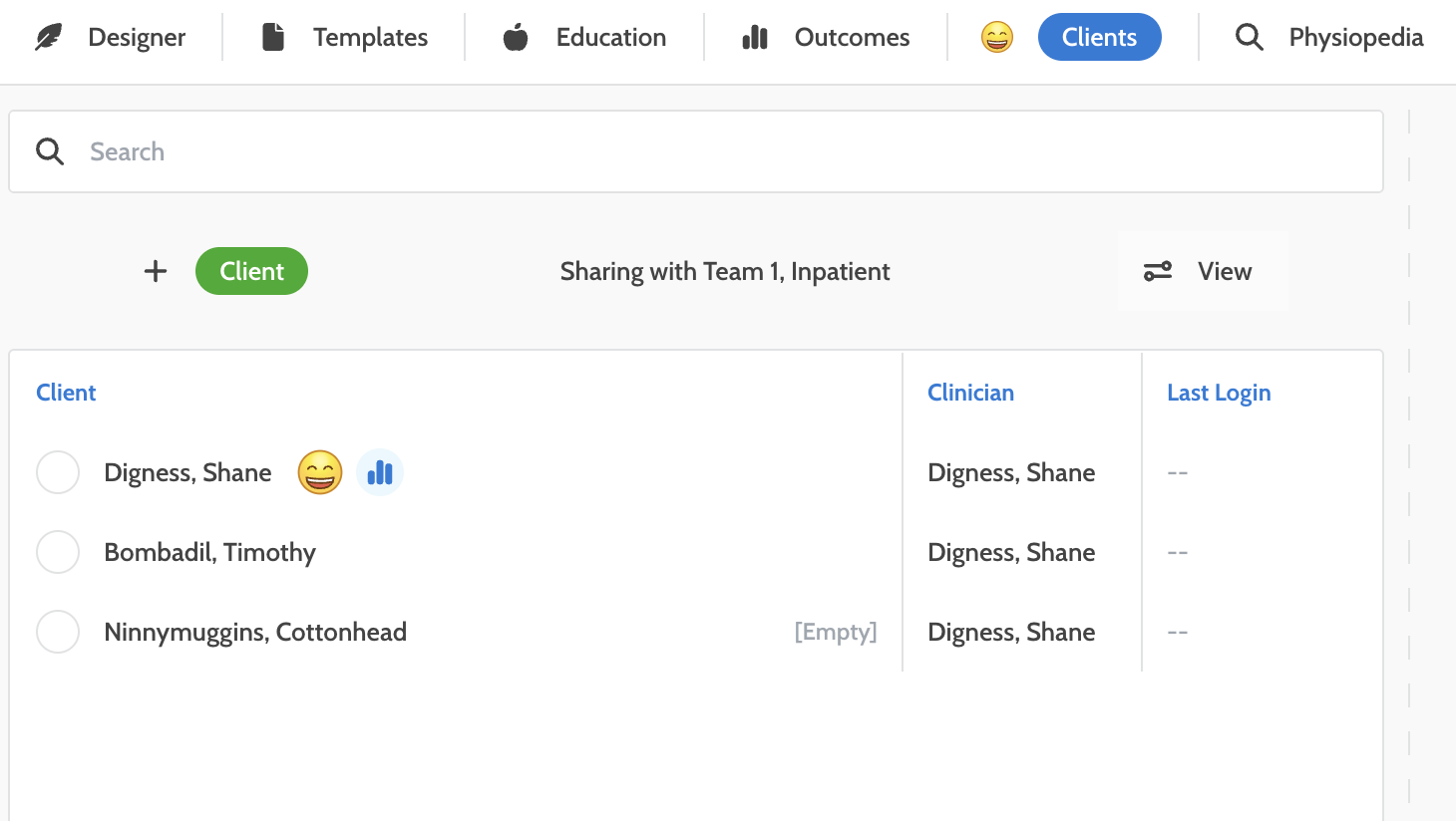 Using the search bar, Staff can search for all Client profiles when "Share Clients" is enabled. The Clinician who last saw the client will be listed to the right of the Client's name.