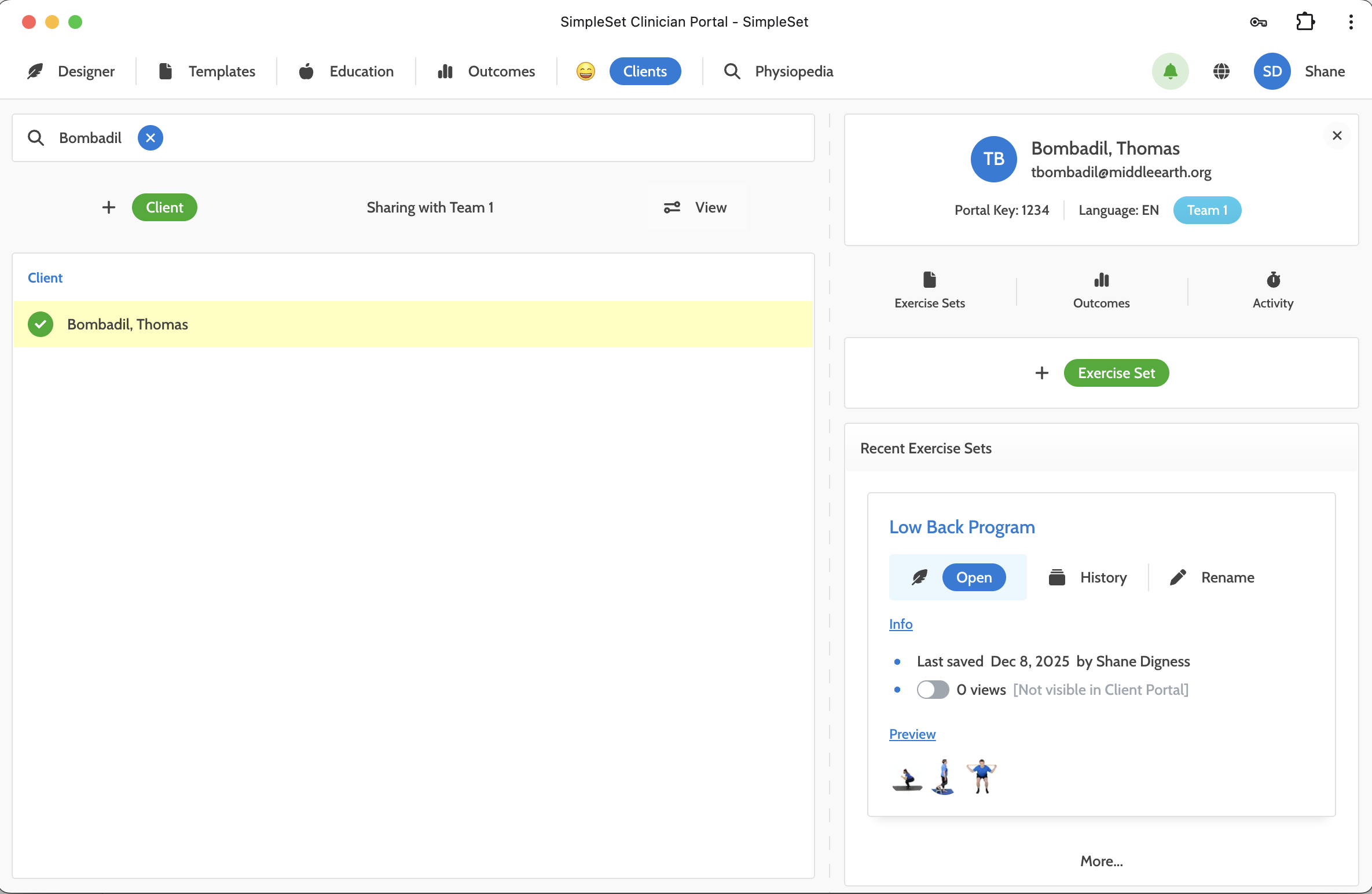 1. To access your client's profile, search for your client in the search bar. From here you can view previously prescribed Exercise Sets, Client Activity or completed Outcome Measures.