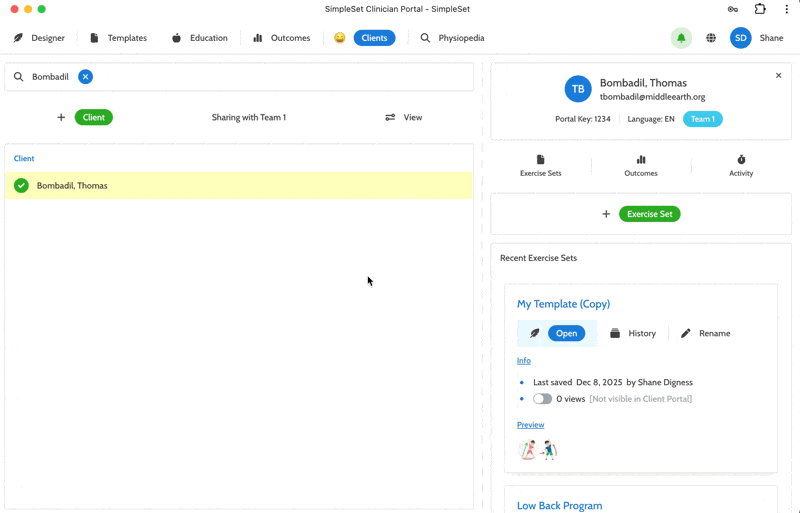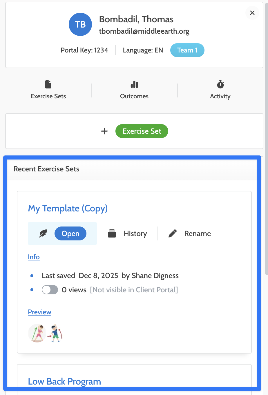 All the information about your client, including their Exercise Sets, is displayed in the Client Manager.