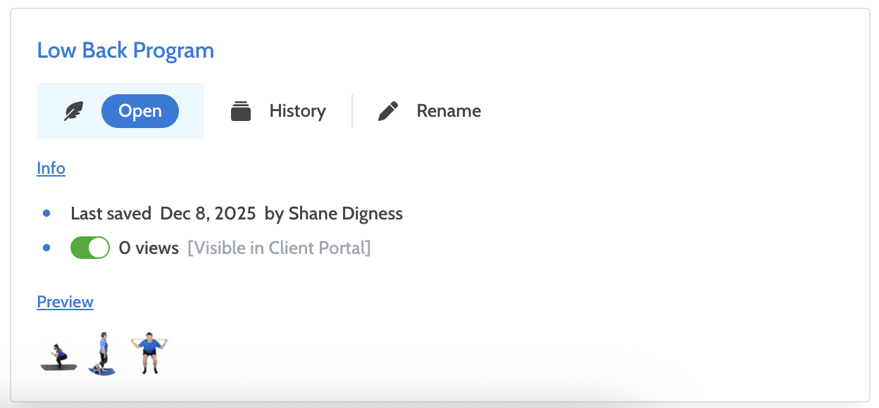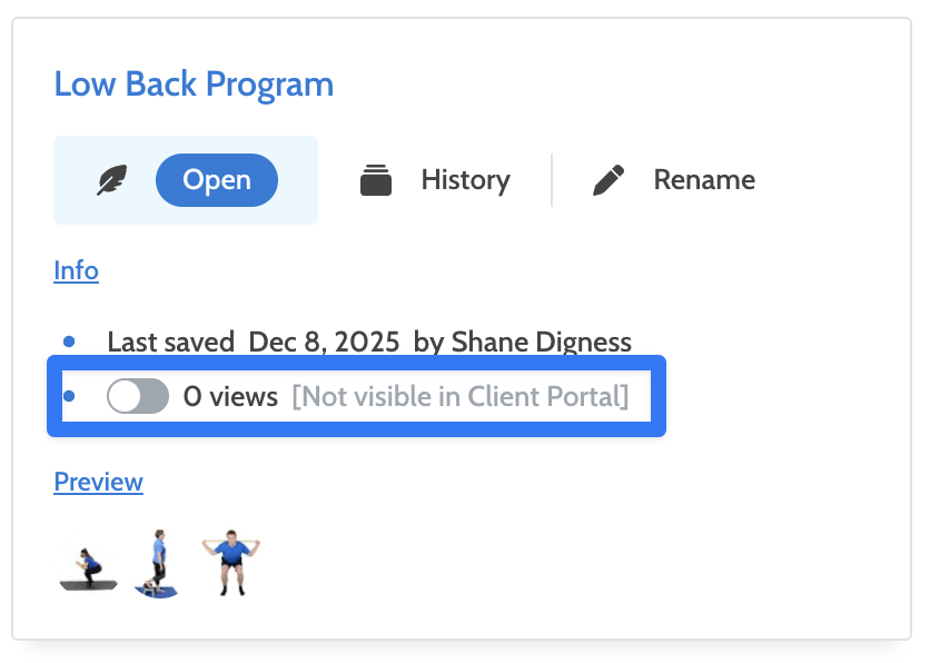 - The toggle function in the "Client Portal" section allows you to show or hide that Exercise Set in the Client Portal. The "Views" show you how many times the client has viewed that Exercise Set.