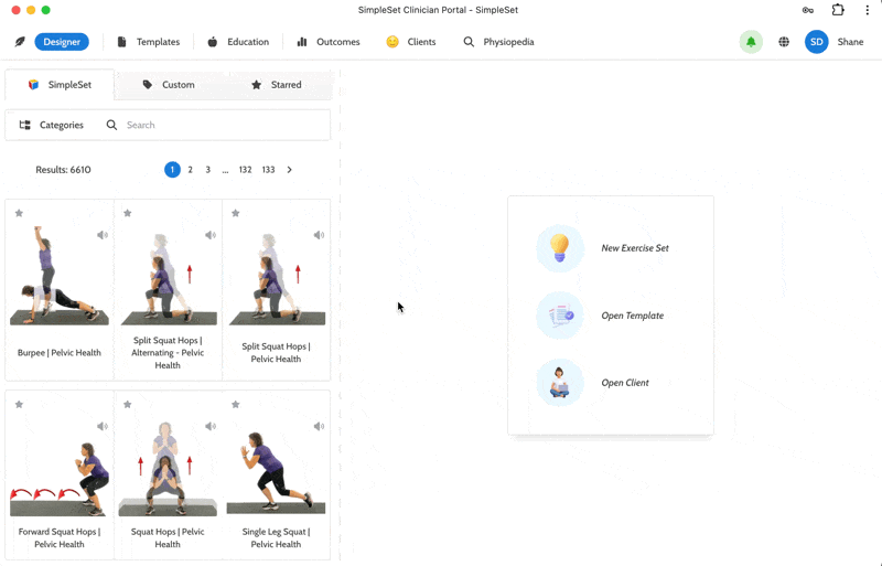 2. In the Exercise Sets tab you will see previously prescribed Exercise Sets. Within each Exercise Set you can rename the set, load into the designer or view the history.