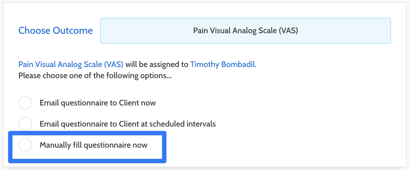 - Once you choose the standardized Outcome Measure for your client, you will be given the options to send it now, at scheduled intervals or if you want to fill out the questionnaire now. If you know you will be asking your client to fill in the outcome measure frequently, the intervals function can handle this for you, so you don't have to remember.