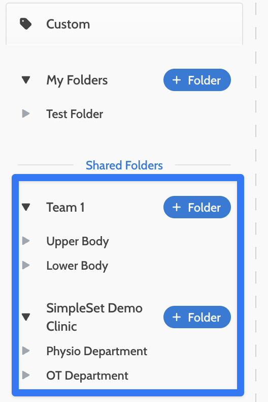 2. Find the "Shared Folders" section and click "+ Folder". Any folders created under Shared Folders will be visible to Staff who have the "Team Folders" Permission active.